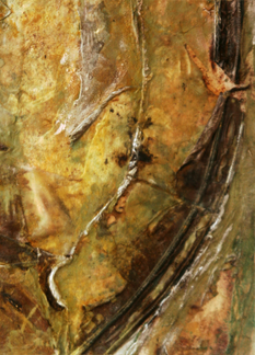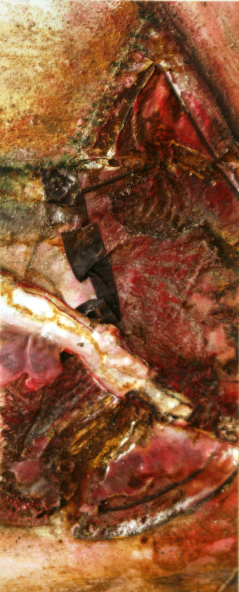 Die Lücken zwischen den Materialien und dem Untergrund (Karton) wurden mit diversen Spachtelmassen, Acrylfarben und Pigmenten in den Farbtönen der Stoffe in harmonischen Farbverläufen verbunden.